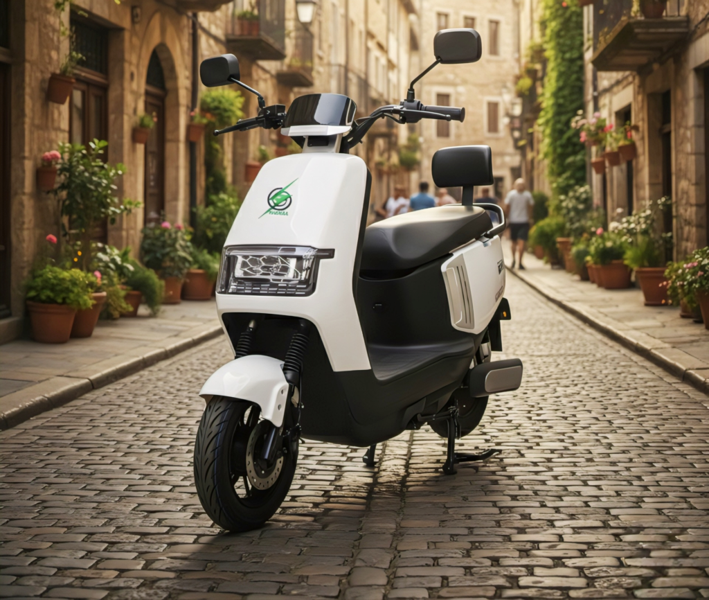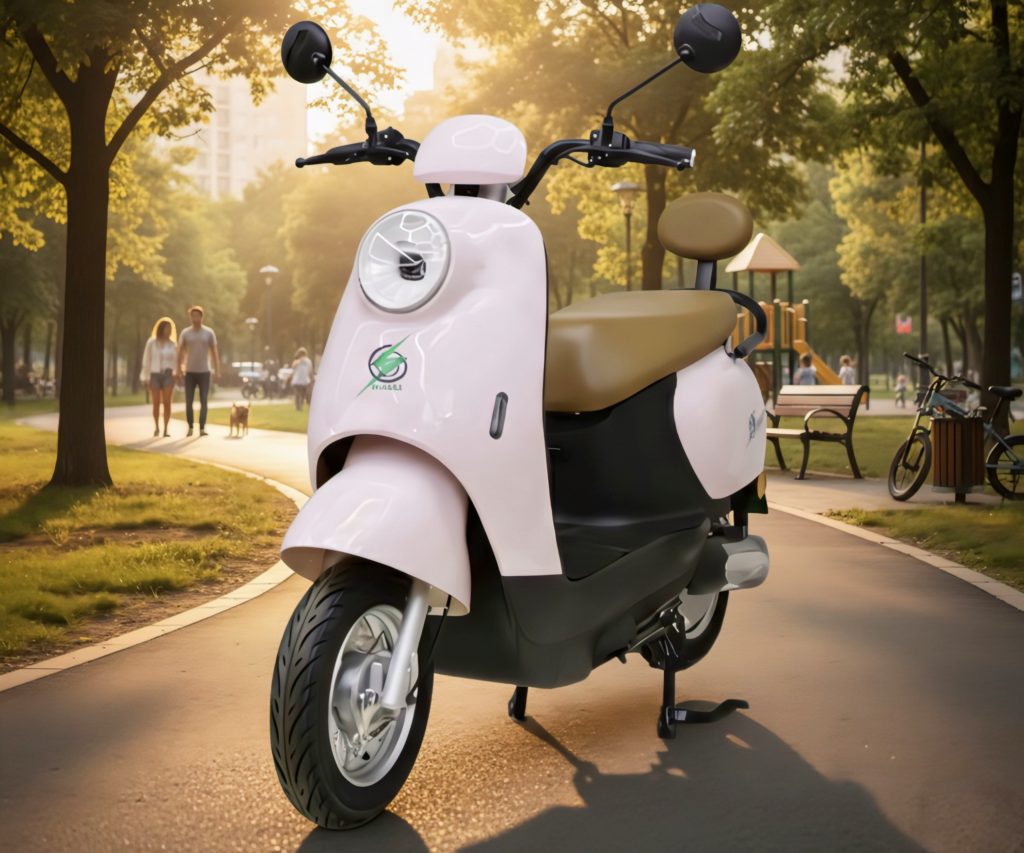 The Skandaa Electric Scooter boasts a sleek, modern design with vibrant color options, featuring body-colored mirrors to complement every rider’s style and personality.